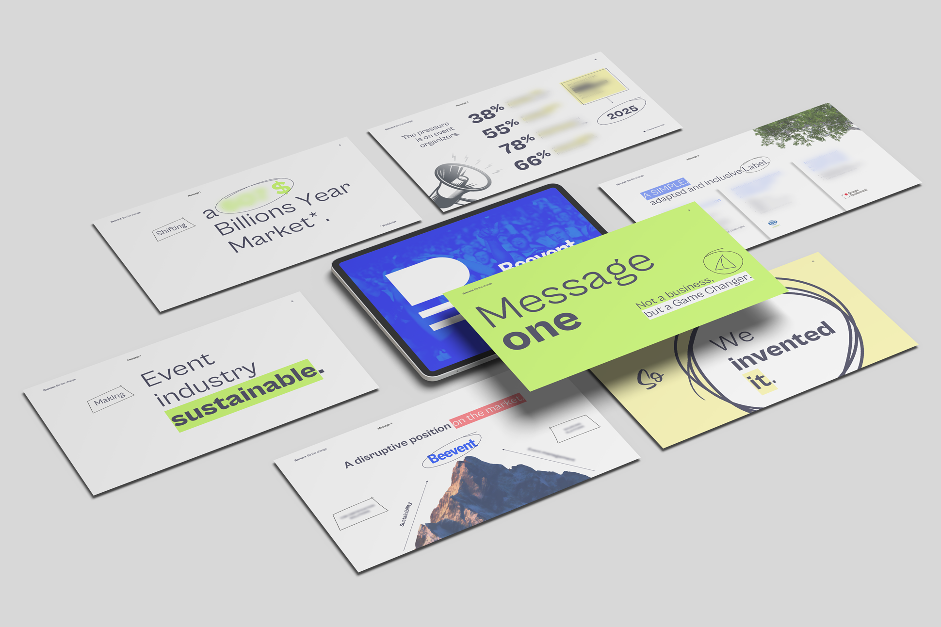 Création d’un pitch deck pour la marque Be Event – Concept et Identité visuelle.